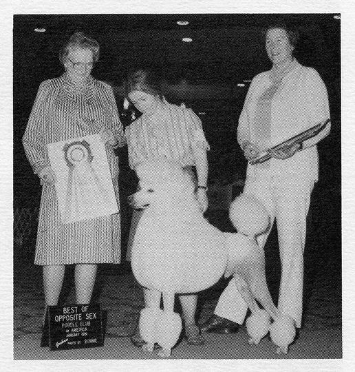 AM CH Eaton Kilamojaro breed by Wilmot Eaton Salisbury a son of ENG CH, AM CH Acadia Stagedoor Johnny. He achieved 2 All Breed Best in Shows and 5 Group One placements along with being a top producer. The picture below was taken at the Miami Regional Poodle Club of America show, he went Breed Best of Oppostie Sex. The two women presenting the awards are none other than Anne Stevenson and Anne Rogers Clark respectfully.