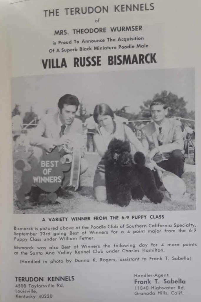 My mom worked for Frank Sabila for several years, they traveled the country showing many breeds. The picture below is the best of breed for the 1972 Poodle Club of America, dog in picture Villa Russe Antoinette.